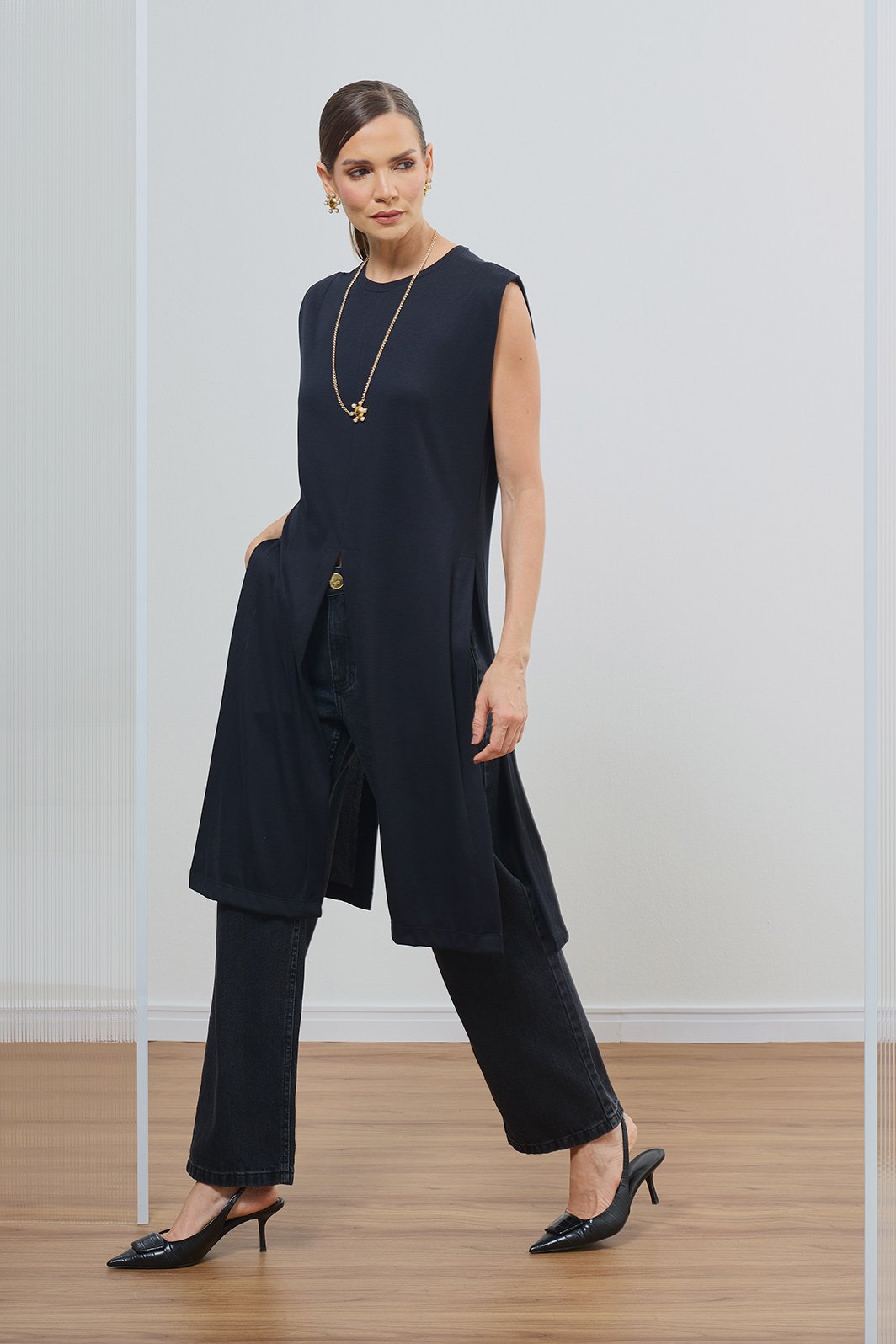 • Caimento: Estruturado nos ombros (estilo muscle tee) com silhueta alongada e fluida.