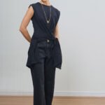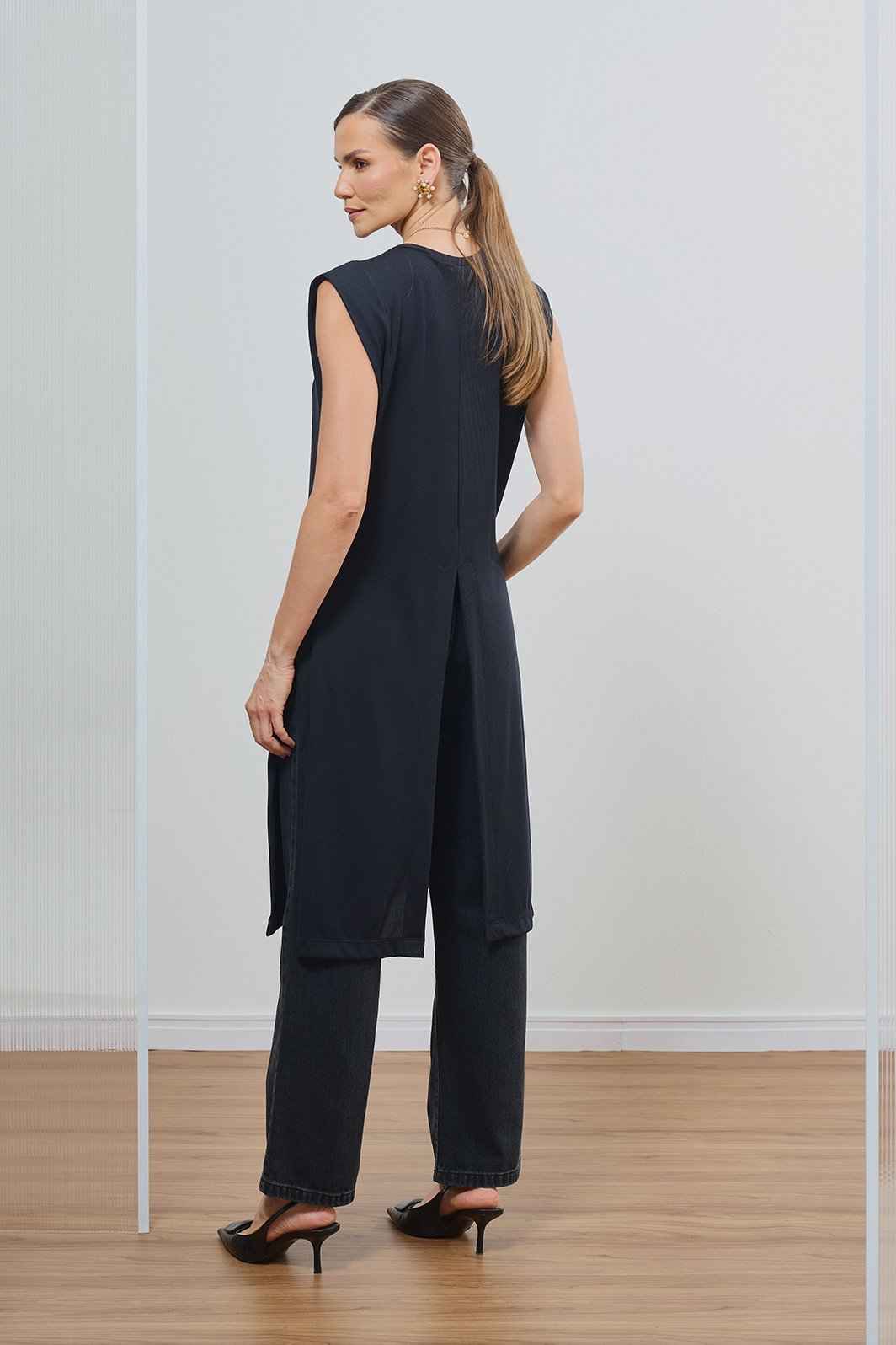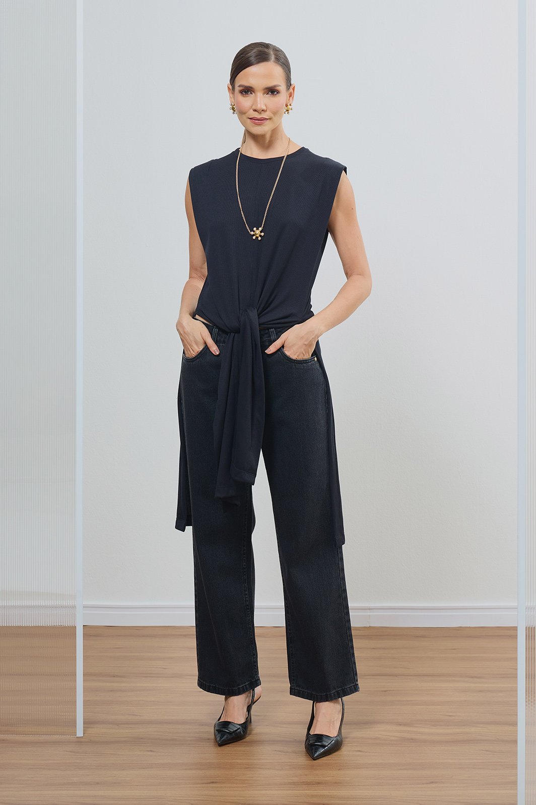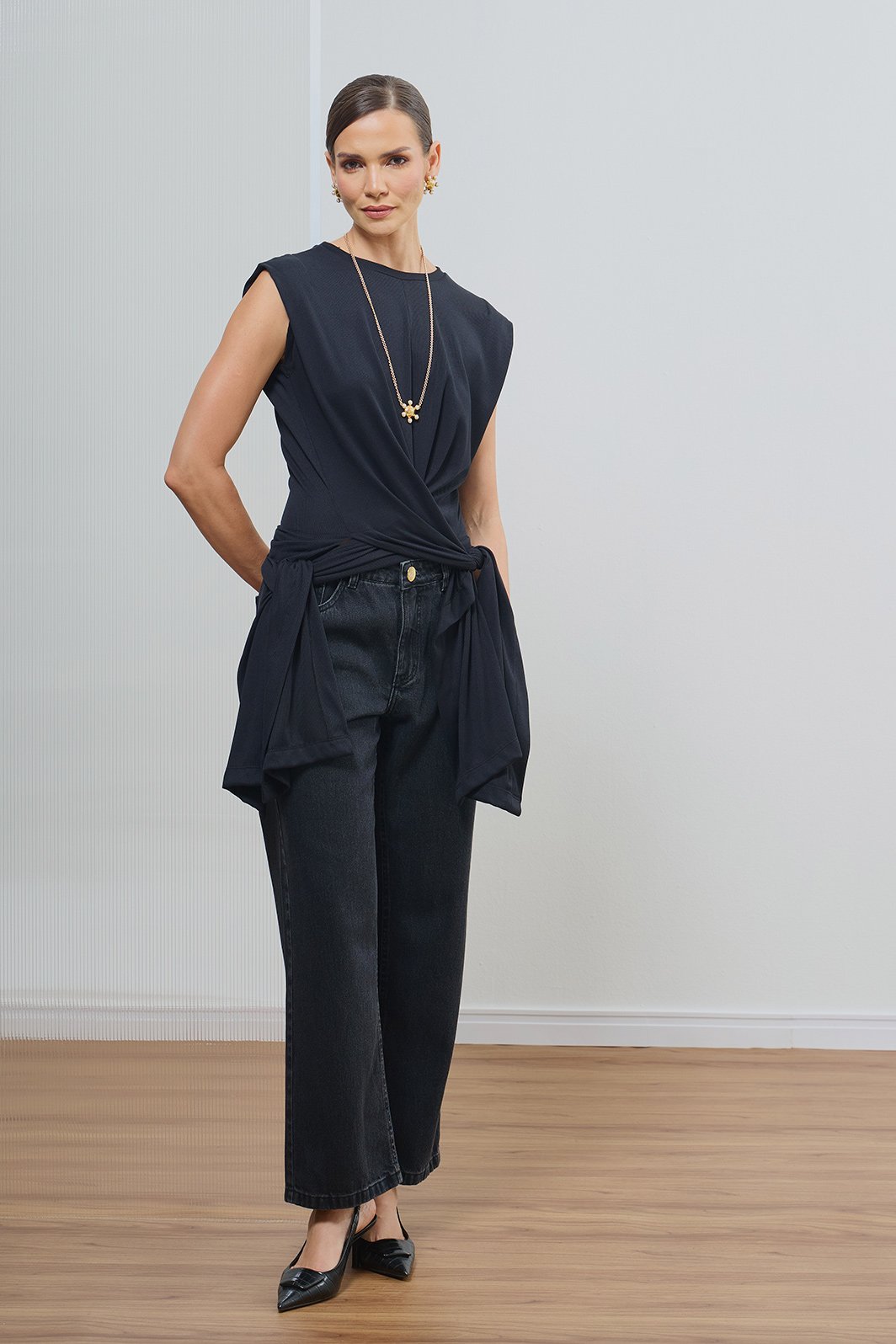 Combine com jeans de lavagem escura ou calças de alfaiataria para um look contemporâneo. Experimente amarrar as pontas na frente para um visual mais ajustado ou deixe-as soltas para criar uma composição de camadas inovadora e elegante.