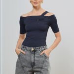 O design assimétrico traz um ar contemporâneo e sofisticado a esta blusa em jersey. Com um jogo de recortes que valoriza o colo de forma sutil e a praticidade das mangas 3/4, é a escolha perfeita para elevar o visual básico com elegância e conforto absoluto.