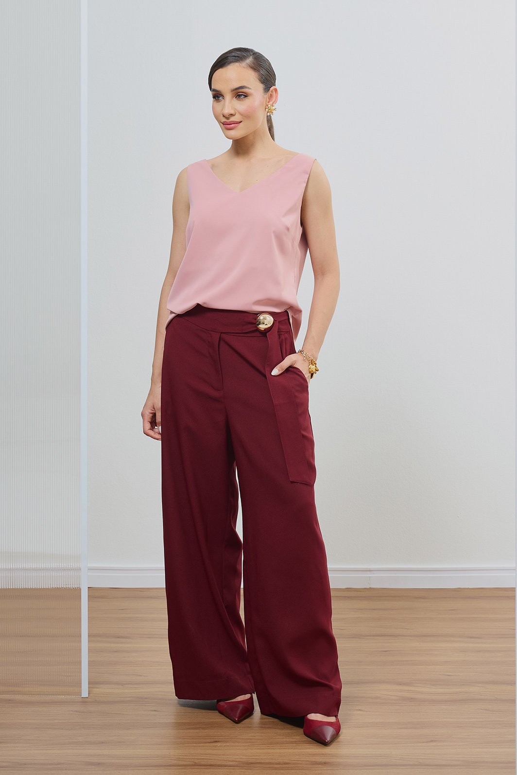 Para um visual moderno, combine com calças de alfaiataria em tons intensos, como o vinho ou terrosos. Em dias de temperatura amena, use sob blazers estruturados ou cardigans leves para manter a sofisticação TOLI.