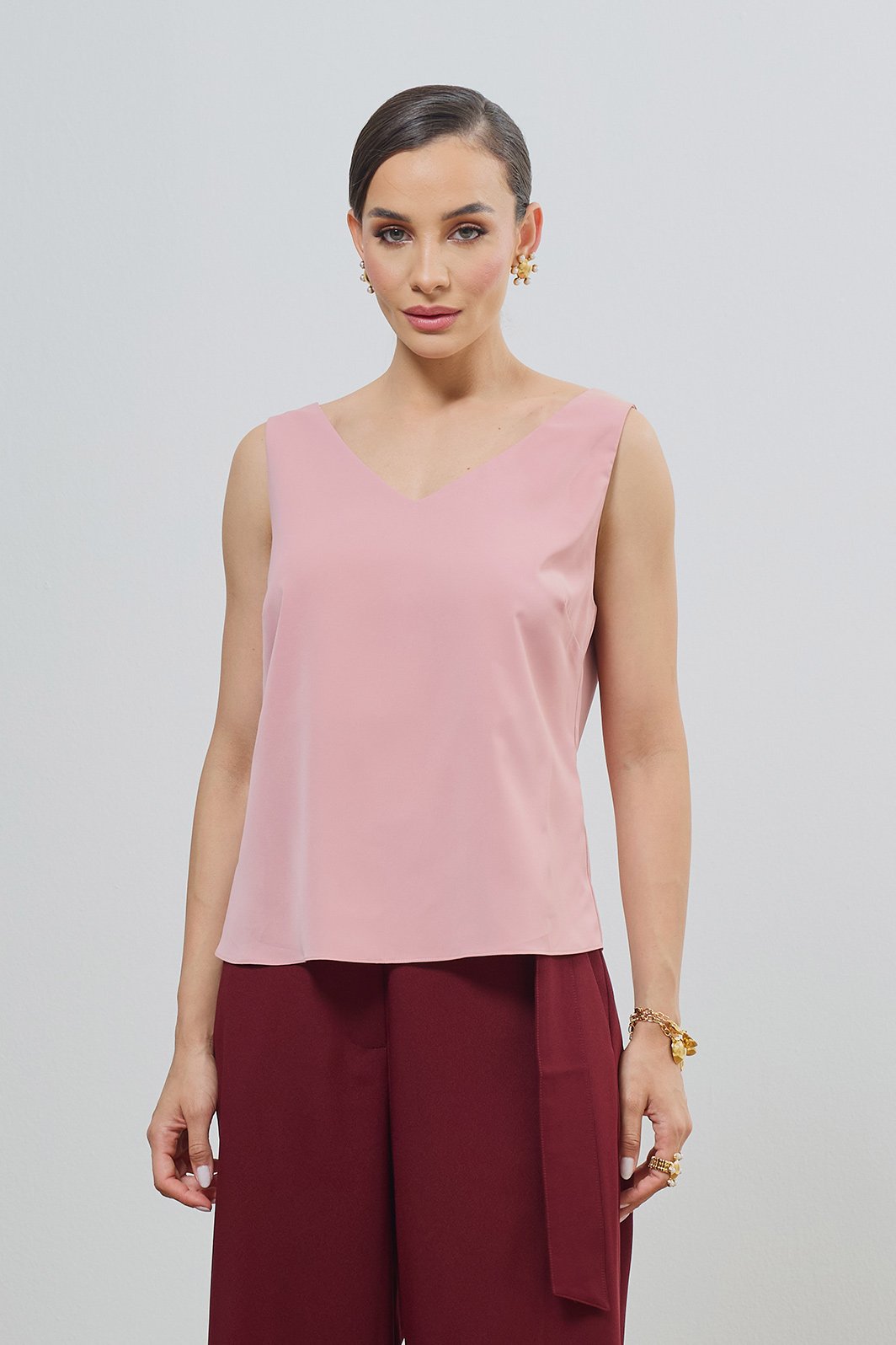 Um básico essencial que une minimalismo e elegância. Com decote V que valoriza o colo e alças largas que garantem conforto, esta blusa em crepe é a base perfeita para produções sofisticadas. Sua fluidez traz leveza e um toque feminino indispensável ao closet.