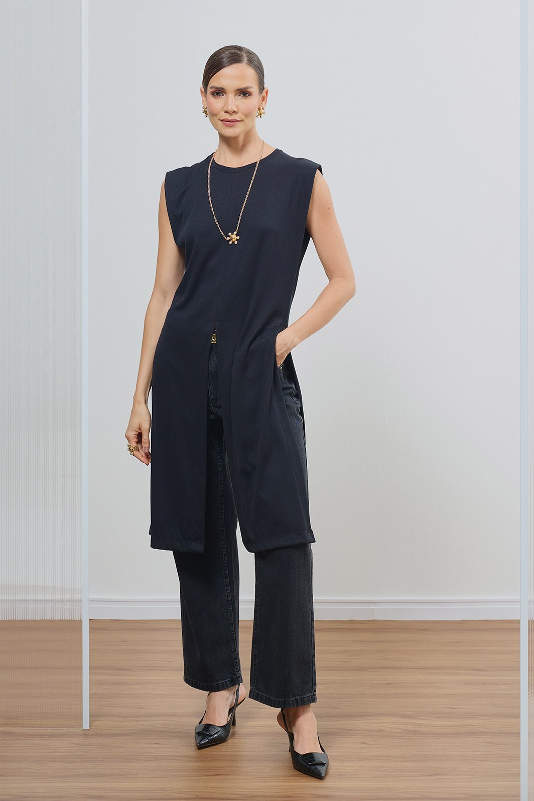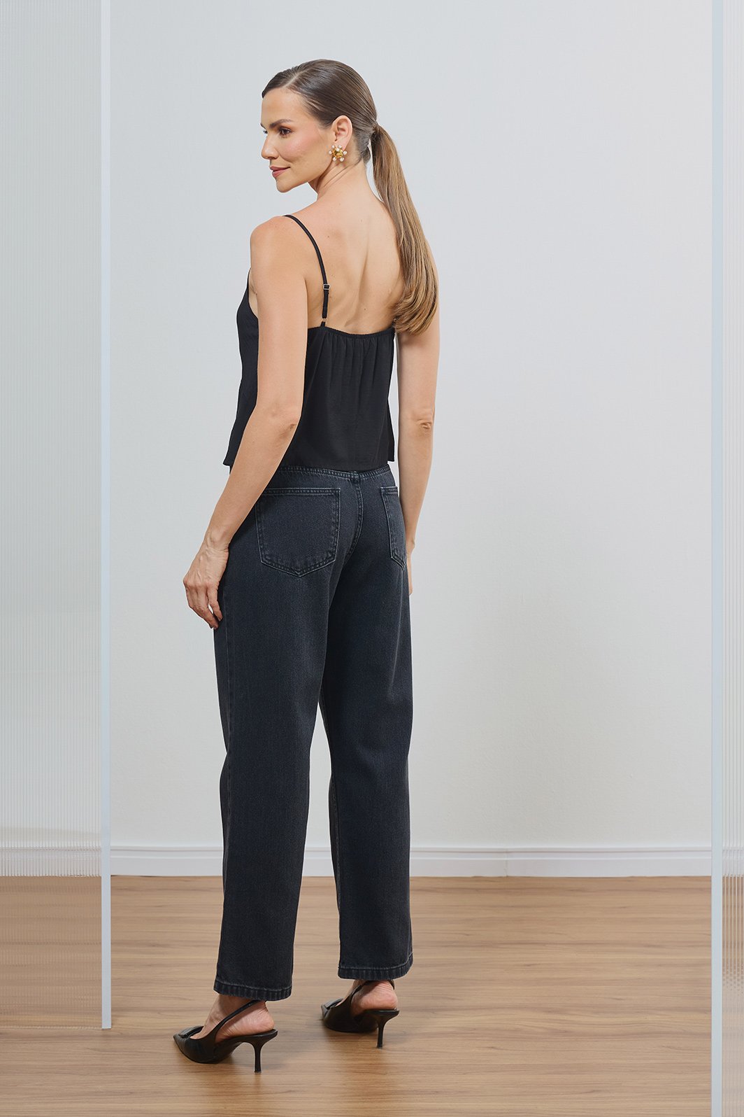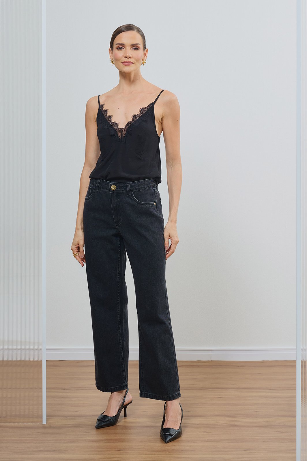 Combine com regatas de renda ou blusas fluidas para um contraste sofisticado de texturas. Nos pés, scarpins de bico fino ou botas de cano curto completam o visual com elegância e atitude.