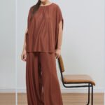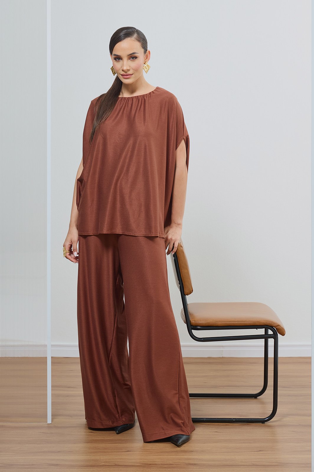 Calça feminina confeccionada em malha jersey de alta qualidade na cor marrom terroso. Apresenta shape reto e cintura com elástico, garantindo um ajuste perfeito que une elegância e conforto absoluto. É uma peça essencial e versátil, ideal para compor conjuntos sofisticados e atemporais com a fluidez característica da marca.