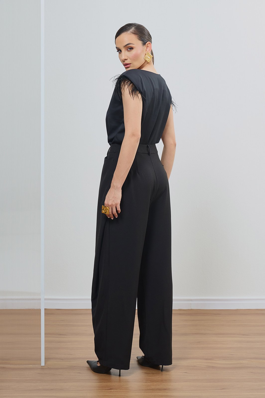 Com design contemporâneo e acabamento de alfaiataria, a calça preta com transpasse lateral traz sofisticação imediata ao visual. A modelagem bem estruturada valoriza a silhueta com elegância, enquanto o detalhe do transpasse adiciona um toque moderno e feminino à peça atemporal.