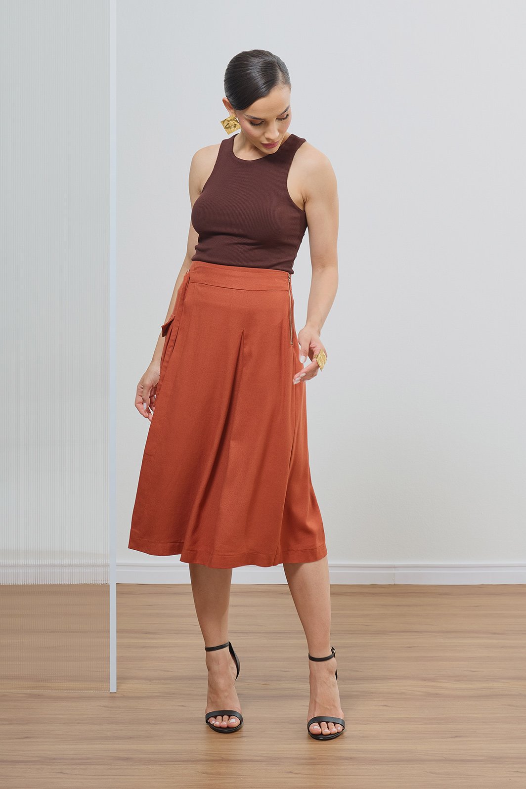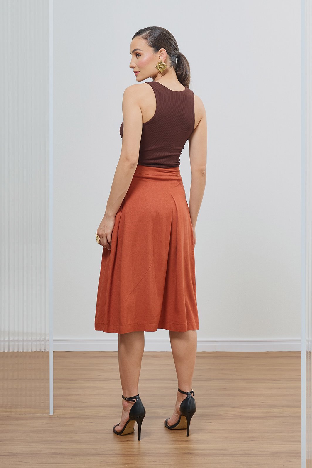 Com elegância natural e design feminino, a saia midi em linho traz o charme do transpasse aliado à sofisticação da fivela lateral. A modelagem valoriza a silhueta com leveza e movimento, enquanto o tom terracota reforça a proposta atemporal e contemporânea da peça.